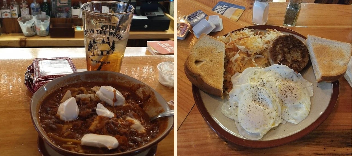 The cozy log cabin decor complements the Northwoods vibe, creating a warm and inviting atmosphere. Just off snowmobile trails, it attracts outdoor enthusiasts seeking a hearty meal after winter adventures. Friends gather here to share stories, enjoy hearty breakfasts, and sip on creative cocktails.