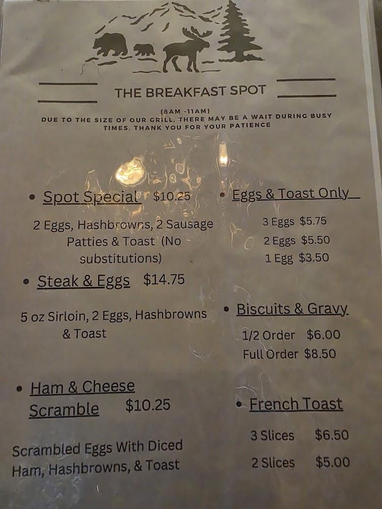 The menu at Spot In the Woods features a variety of options, catering to many appetites. Breakfast is particularly popular, with dishes like the incredible pancakes and savory meats starting the day off right. For lunch and dinner, the burgers and fish fries stand out.